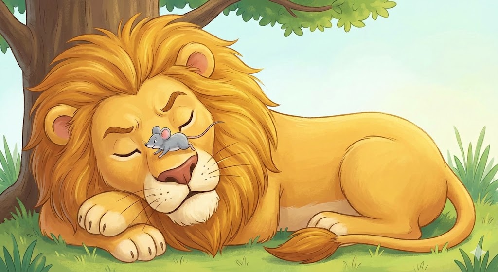 A tiny Mouse runs by. He runs over the Lion’s nose!